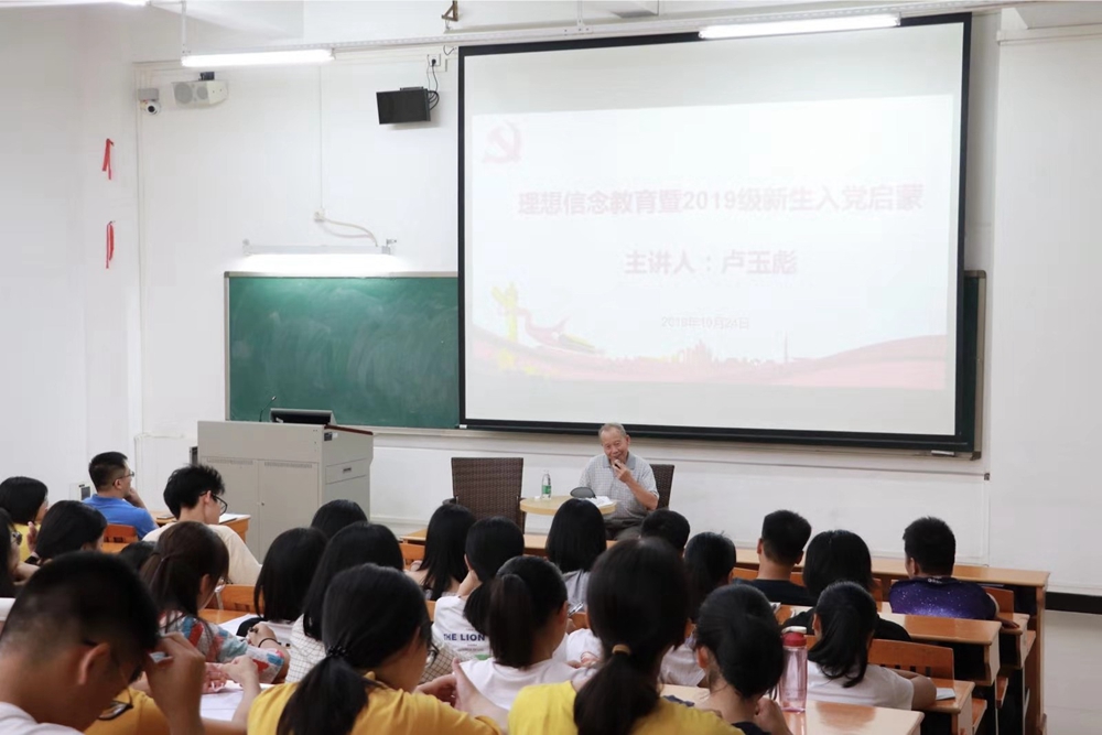 为扎实开展“不忘初心、牢记使命”主题教育,引导2019级学生进一步了解党的历史,加深对党的认识,端正入党动机,坚定共产主义理想信念,10月24日,法学与知识产权学院在白云校区三教107举办“理想信念教育暨2019级新生入党启蒙”专题讲座,学校关工委委员卢玉彪老师应邀作专题报告,学院党总支书记许建鑫、副书记李雪斌,辅导员伍瑛参加会议。李雪斌主持会议。