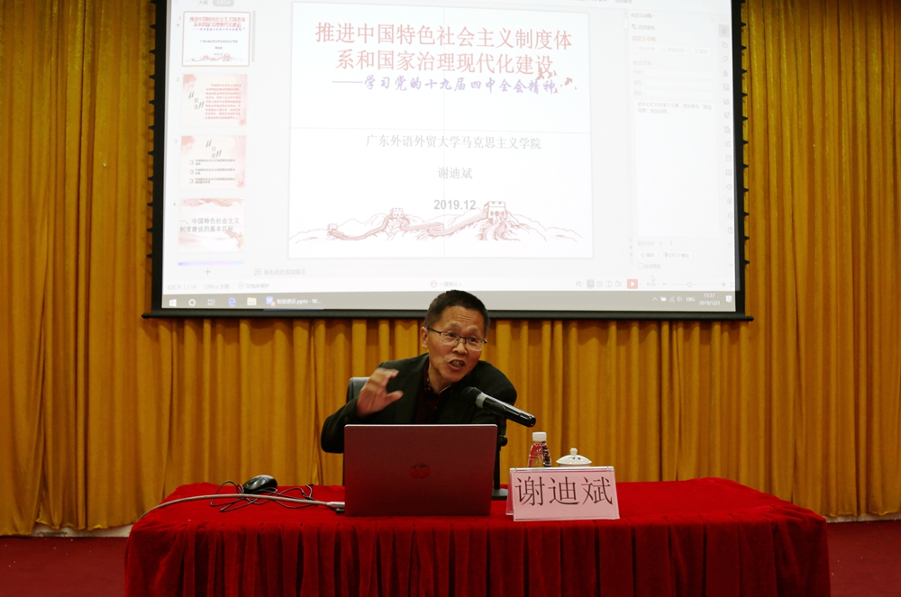 为进一步强化学校“不忘初心、牢记使命”主题教育成效,深入学习宣传贯彻党的十九届四中全会精神,12月3日,机关党委邀请广东外语外贸大学马克思主义学院院长谢迪斌教授来我校开展机关大讲堂暨德育论坛,机关党委全体科级及以下党员、全校辅导员及民主党派代表参加。讲堂由机关党委书记李琴主持。