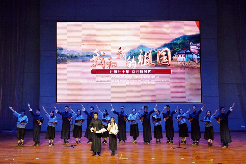 第三篇章“梦想▪启航”,诗朗诵《我和我的祖国》讴歌了伟大中华人民共和国70年的砥砺奋进,表达了学子们作为一名中国人的骄傲和自豪,也为祖国送上深深的祝福。舞蹈《不忘初心》跳出青年昂扬进取的面貌,勉励青年学子听党话、跟党走,为实现中华民族伟大复兴的中国梦贡献青春力量。《我们都是追梦人》由全体学生干部和老师共同演绎,大家随着音乐,热情挥舞着手中的荧光棒,感受新中国成立70年来的辉煌成就,传递出赤诚的爱国情。