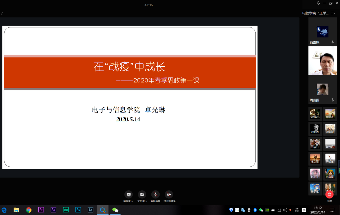 为贯彻落实学校党委《关于做好2020年春季学期党委书记、校长和各学院党组织书记、院长上第一堂思想政治理论课工作的通知》要求,扎实做好疫情期间学生思想政治教育工作,5月14日,电子与信息学院党委书记卓光琳、院长徐小平分别在企业微信平台上讲授了春季学期思政第一课。学院全体辅导员老师、2018级与2019级全体班委一起聆听了此次讲课。