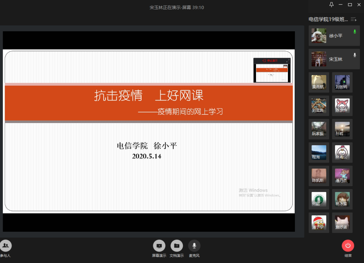 徐小平讲课题目为《抗击疫情,上好网课》。她结合同学们关心的教学、考核安排,为同学们上了一节生动有趣的思政课。徐小平着重表扬了2019级同学们自发组织线上晨读活动,展示了良好的学风,为其他年级同学树立了学习榜样。徐小平为同学们分析了当前学校的疫情防控情况,指出我国疫情在较短时间内基本得到控制,再一次彰显了中国特色社会主义制度的优越性,进而进一步坚定了“四个自信”。她鼓励同学们珍惜来之不易的防疫成果,继续遵守学校各项工作安排,积极配合老师们完成上课的各个环节,做好当下的每一件事情。