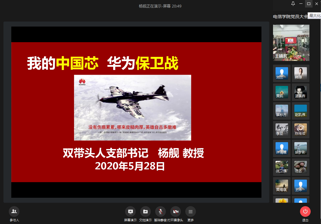 5月28日,电子与信息学院党委在企业微信上开展了线上主题党日活动,“双带头人”党支部书记、硕士生导师杨舰教授作题为《我的中国芯,华为保卫战》的党课,电子与信息学院全体党员参加了此次党日活动。活动由学院党委书记卓光琳主持。