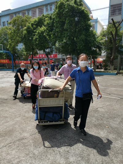 7月3日下午17时,财经学院领导班子集体深入宿舍,为财16财管3的欧淑义同学搬运好所有行李,在北校区校门《好久不见、欢迎回家》宣传墙处与欧淑义同学合影,依依送别财经学院最后一名离校毕业生。