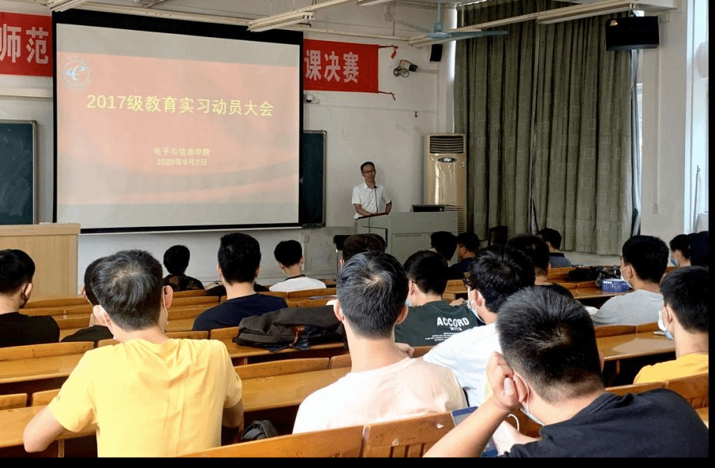 9月2日,电子与信息学院在二教204召开了师范毕业生教育实习动员大会,学院党委副书记罗旭辉、副院长柳秀山、系主任钟旭、实习指导教师以及106名实习学生参加了会议。