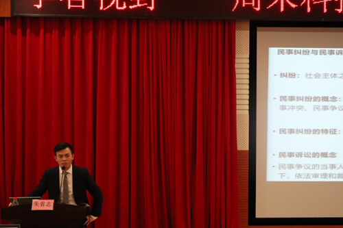 闭幕式后,由学校团委主办的“学者视野——周末科技文化艺术系列讲座”第900讲暨宪法法律知识讲座第四讲开讲,法学与知识产权学院朱省志博士主讲《宪法与民事诉讼——以诉权为中心》。