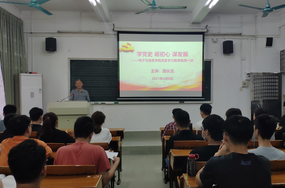 4月8日,电子与信息学院在东校区举行了“学党史•励初心▪谋发展”党史学习教育,校关工委田长生教授应邀讲授专题党课,学院全体学生党员和入党积极分子共100余人参加此次活动。