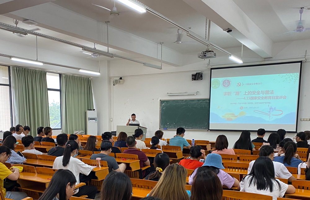 2021年4月15日是第6个全民国家安全教育日。为进一步深化党史学习教育,提升为师生办实事的能力,增强学生的法律意识和求职安全意识,当天下午,法学与知识产权学院、汽车与交通工程学院在三教206教室联合开展求职“路”上的安全与普法讲座。师生代表200余人参加了讲座。