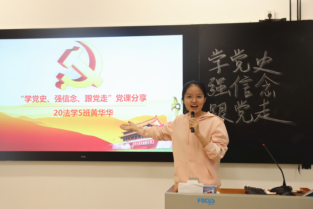 在诵读中,同学们结合“中国共产党党史、新中国史、改革开放史、社会主义发展史”内容进行了诵读和心得分享。20级法学4班杨霞同学结合中国共产党的成立,从“红船精神”的内涵、重要意义以及弘扬“红船精神”谱写新篇章等三个方面阐述了“红船精神”的时代意义和老一辈共产党人正确坚定的理想信念与高尚纯洁的道德情操。20级法学5班邬怡婷同学分享了广西百坭村第一书记黄文秀,在研究生毕业后线倾情投入、奉献自我,用美好青春诠释了共产党人的初心使命,把人民放在心中最高位置,不辞辛劳、志比钢坚,立足岗位,实实在在为人民办实事、解难事、做好事的感人事迹。