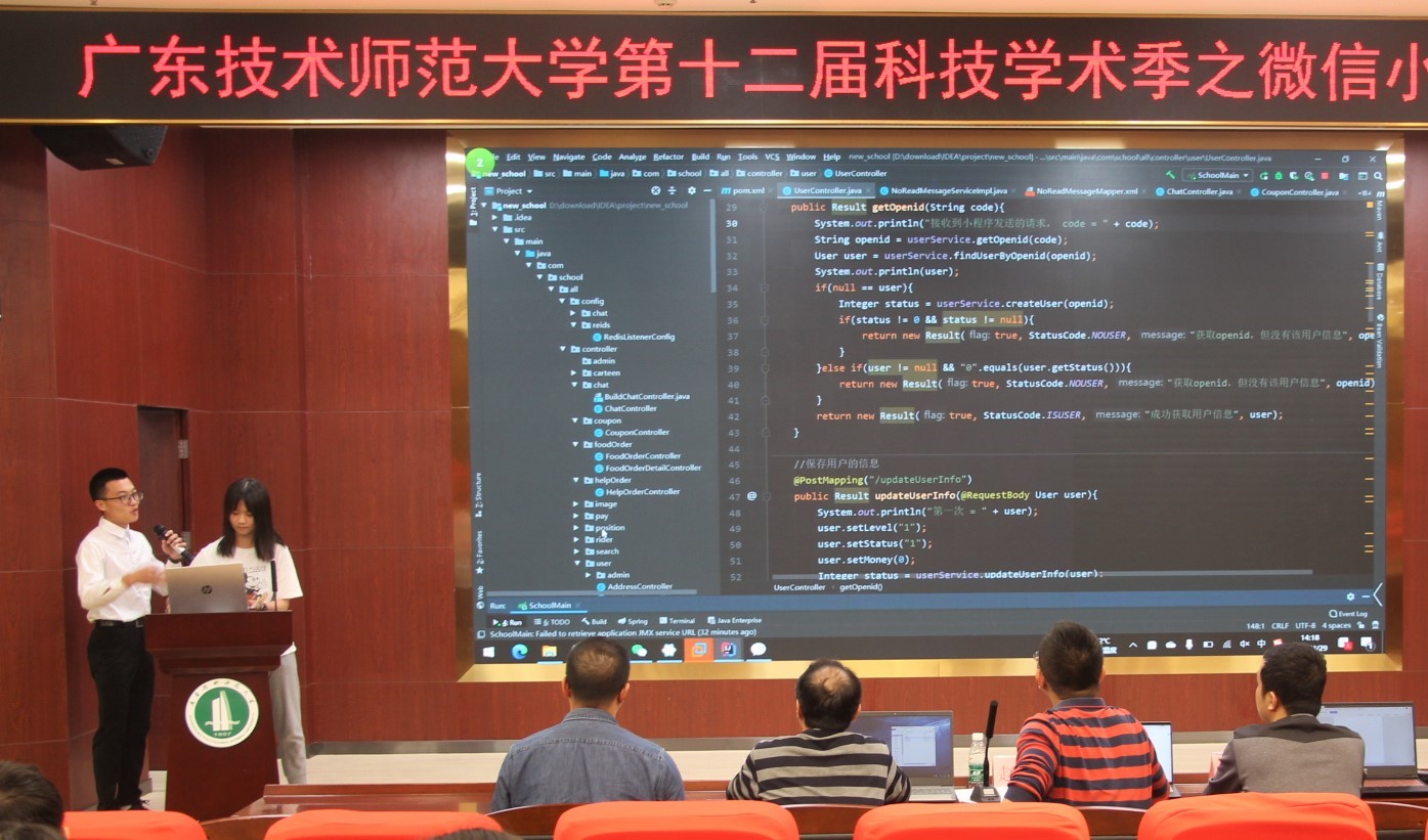 为提升学生Web应用的设计与开发能力,尤其是运用微信生态小程序平台开发技术进行创新实践的能力,实现以赛促学、以赛促教、以赛促用,4月29日,计算机科学学院在一教208举办第十三届IT科技活动月之微信小程序设计大赛决赛。计算机科学学院副教授赵剑冬、副教授黄超及曾宪贤老师担任本次大赛评委,150余名学生参与了本次活动。