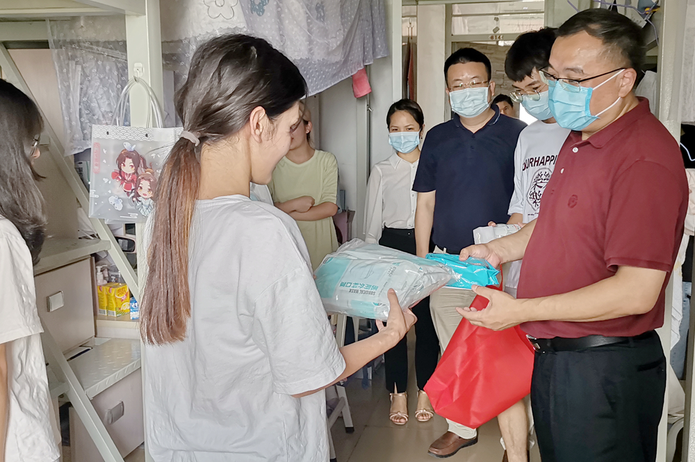 6月15日,学院党委书记杨延军、副书记蒋鹏带领辅导员深入走访学生宿舍,并为学生送去防疫物资爱心包,包括医用防护口罩、免洗洗手液、酒精喷雾、酒精湿巾等。走访过程中,杨延军详细了解学生的家庭、学习情况和防疫情况,要求同学们平时上课、校园活动时戴好口罩,鼓励大家将食堂饭菜打包回宿舍食用,减少不必要接触。学院政工干部们细心叮嘱学生,遇到困难要找老师及时反馈,要做好个人健康的第一责任人,严格遵守国家和学校疫情防控的相关要求,主动上报健康情况,戴口罩、勤洗手、不聚集,坚定信心共同打赢疫情防控阻击战。同学们纷纷对学院领导的关心表示感谢,表态将做好个人防护,安心学习。