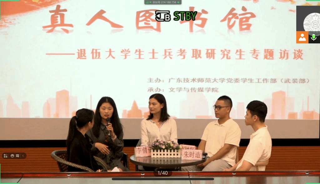 据悉,近年来我校涌现出了李倩倩、孙辰霞、李观旺、卢钟坚、朱时造、黄小坚、游雨佳共7名退伍大学生士兵成功考取研究生的事迹。我校学子积极投身国防,勇于攀登深造的事迹,正体现出了当代青年学子的风采和担当。由于疫情原因,本期“真人图书馆”采用了线上直播方式进行,以生动鲜活的学习榜样和阅读体验,讲好广师大好故事,让“真人图书”不断促进广师大学子进步、成长,鼓舞更多学子参军报国,文武兼修。