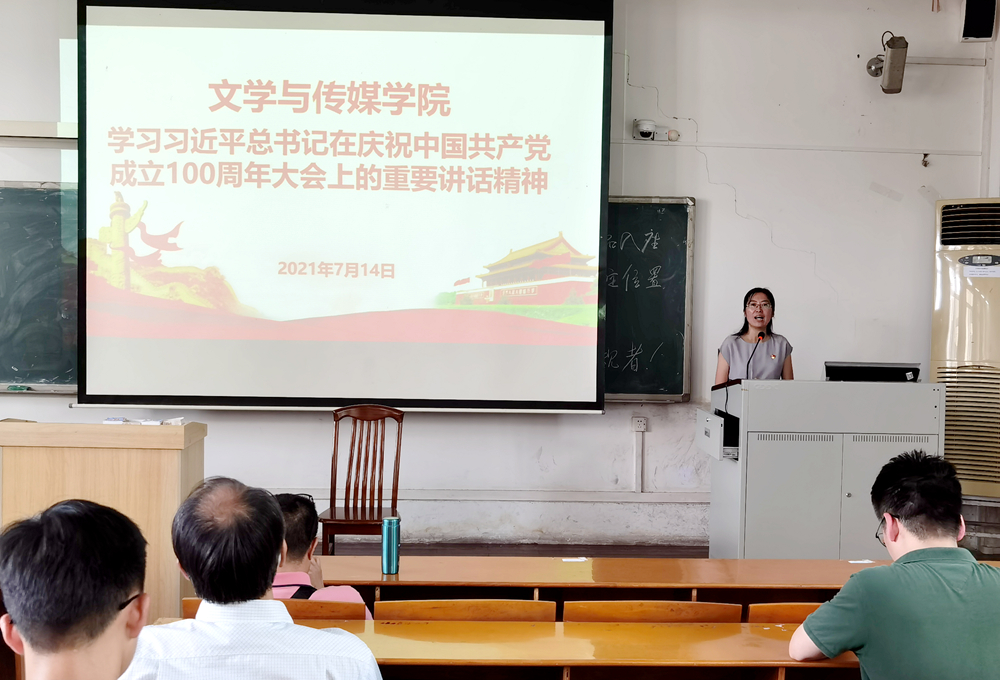学院中国文学系系主任刘茉琳老师、辅导员林庆老师分别就学习习近平总书记在庆祝中国共产党成立100周年大会上重要讲话精神心得进行了分享。两位老师从改革发展、脱贫攻坚、抗击疫情等方面充分肯定了中国特色社会主义道路是实现民族复兴之路、国家富强之路、人民幸福之路,只有坚持中国共产党领导才能实现中华民族伟大复兴。