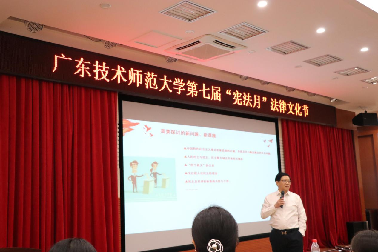 11月1日,我校第七届宪法月法律文化节开幕式在白云校区第三教学楼104报告厅举办。中国宪法学研究会副会长、广东省宪法学研究会会长、华南理工大学法学院博士研究生导师、国务院政府特殊津贴专家、学校达之讲座教授吴家清老师,学校办公室副主任兼依法治校办公室主任杨光洲,法学与知识产权学院党政领导班子全体成员、全院教职工,各学院学生代表共300余人参加了本次活动。