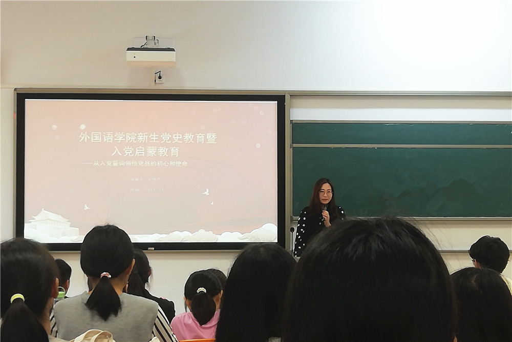 为加深新生对中国共产党的认识和了解,引导新生积极主动向党组织靠拢,外国语学院于11月4日在河源校区开展新生入党启蒙教育讲座。讲座由学院党委副书记王琴琴主讲,辅导员和2021级新生入党积极分子积极参加。