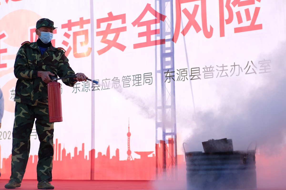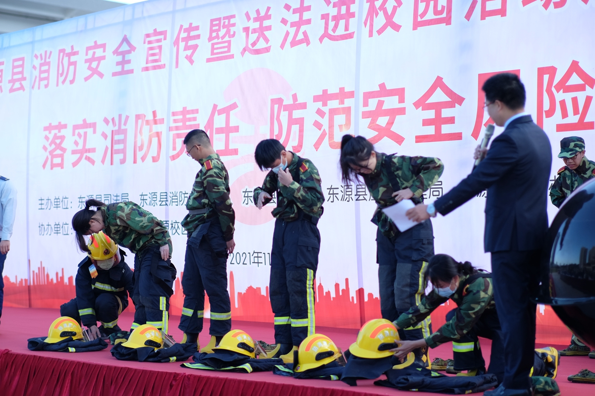 随后,河源校区管委会以及东源县与会领导参与启动仪式,宣布本次活动正式开始。活动现场还举行了法律和消防知识有奖问答、消防队员指导同学试穿消防服和使用灭火器等活动,全体与会人员近距离观摩了消防演练。