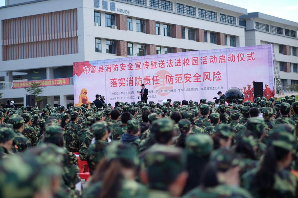 11月9日,为进一步提升我校河源校区广大师生法律法规和消防安全知识,弘扬法治精神,做好校园普法和消防安全工作,提高学生和教职员工的消防安全意识和自防自救能力,我校河源校区管委会联合东源县司法局、东源县普法办公室、东源县消防救援大队、东源县公安局、东源县应急管理局在河源校区正门广场举办东源县消防安全宣传暨送法进校园启动仪式。本次活动以“落实消防责任 防范安全风险”为主题,东源县县政府党组成员、副县长蓝锦建、东源县各相关单位主要负责同志、河源校区管委会全体工作人员、河源校区全体辅导员以及近1600名学生参加本次活动。
