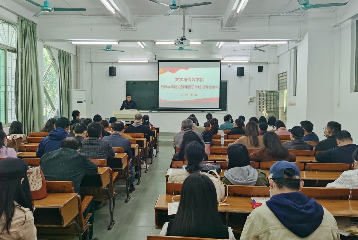 深入贯彻落实习近平总书记重要讲话精神,树立优良师德师风,提高教育教学质量,引导教职工贯彻落实“课程思政”教育理念,12月4日,文学与传媒学院在东校区一教105教室召开教风学风建设暨课程思政建设专题会议。学院党政领导班子成员、学院全体教师参加会议。会议由学院院长项裕荣主持。