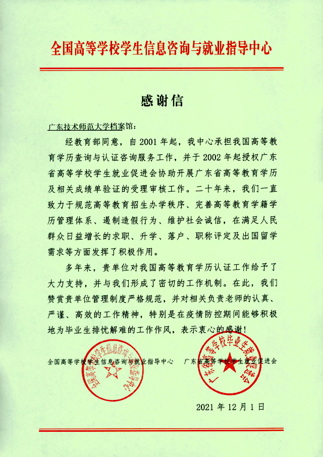 感谢信赞扬了我校档案馆严格规范的管理制度,并对我校档案馆长期对高等教育学历认证工作的大力支持以及相关负责老师认真、严谨、高效的工作精神,特别是在疫情防控期间积极为毕业生排忧解难的工作作风表示衷心感谢。