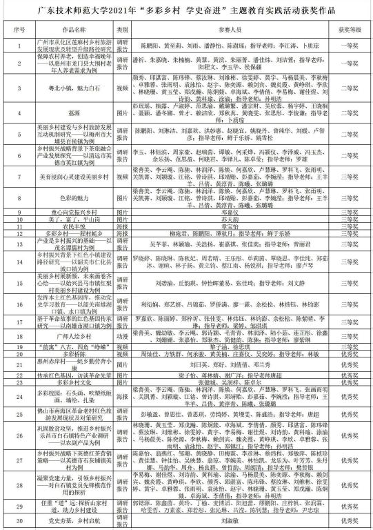 近日,广东省人民政府地方志办公室举办了2021年“多彩乡村 学史奋进”主题教育实践活动总结暨成果推介会,会议宣读了优秀作品和优秀组织单位通报。我校在此次主题教育实践活动竞赛中取得可喜佳绩,共获得一等奖2项、二等奖4项、三等奖13项、优秀奖11项,同时获评优秀组织奖。