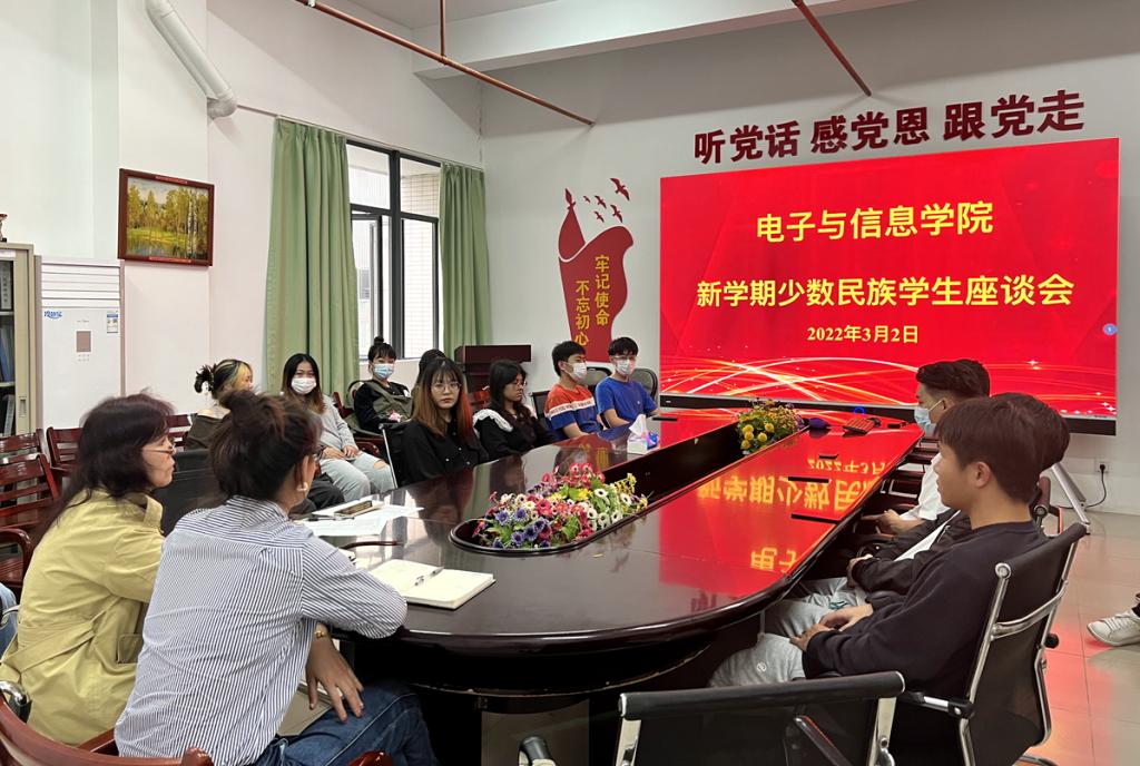 为进一步做好少数民族学生教育、管理和服务工作,努力培养政治立场坚定、专业素质过硬的建设者和接班人,促进民族团结融合,了解和关心少数民族学生的思想、学习和生活,引导其以饱满的精神状态迎接新学期,3月2日,电子与信息学院召开新学期新疆籍少数民族学生座谈会,3月7日召开21级海南预科班少数民族座谈会,内派教师阿尔孜古力,辅导员韩琼以及少数民族学生参加了本次座谈会。
