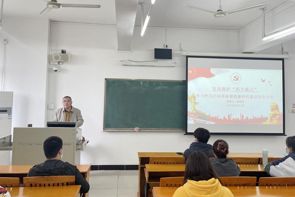 杨延军以《坚决拥护“两个确立”,努力把自己培养成堪担新时代重任的大学生》为题,通过对伟大政党、理论创新、大国崛起、不忘初心、人类命运共同体“五座丰碑”的阐述,引导学生充分认识党的十九届六中全会召开的重要意义;通过“理想创引、核心创立、宗旨创设、理论创新、制度创建、精神创铸、改革创举、复兴创业、统战创同、天下创和、军队创强、党建创先”等方面,阐释十九届六中全会的核心要义和实践要求,引导青年学生深刻领会“两个确立”的决定性意义。最后,杨书记引用习近平总书记对大学生的寄语,希望全院学子树立远大理想、厚植爱国情怀,担当时代重任、勇于砥砺奋斗,练就过硬本领、锤炼品德修为,努力成为堪当民族复兴重任的时代新人。