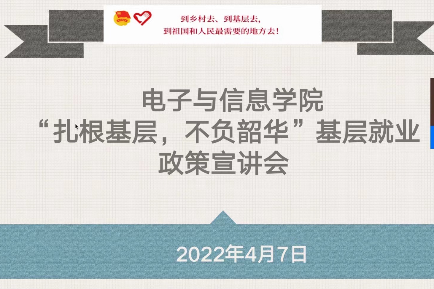 为引导学生到基层建功立业,4月7日,电子与信息学院举办了“扎根基层,不负韶华”——三支一扶计划和大学生志愿服务西部(山区)计划宣传动员会,本次采用腾讯会议线上开展,各级学生近100人参会。