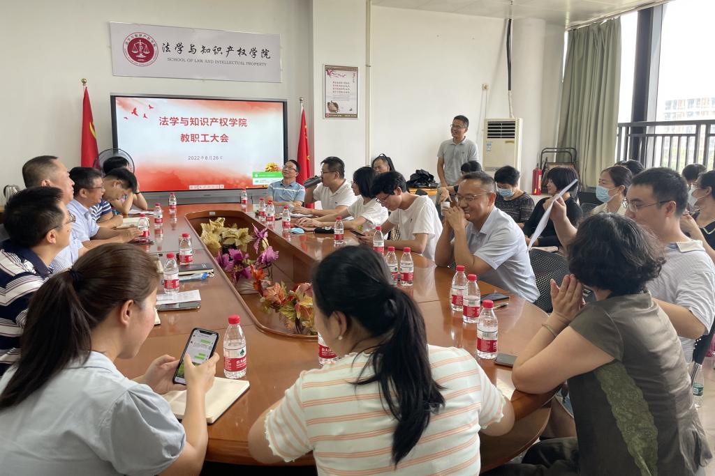 8月26日,法学与知识产权学院在白云校区召开2022年秋季学期全院教职工大会,传达学校工作会议的主要精神,部署学院新学期工作,学院全体教职工参加了会议。会议由学院党委书记许建鑫主持。