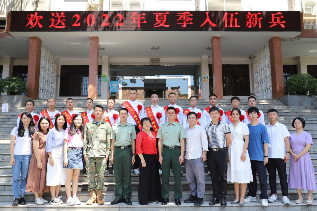 9月4日,学校在东校区举行2022年大学生退役复学同学欢迎会暨入伍同学欢送会。武装部负责人、辅导员、退伍复学士兵代表及天河区13名预定新兵等参加了活动。