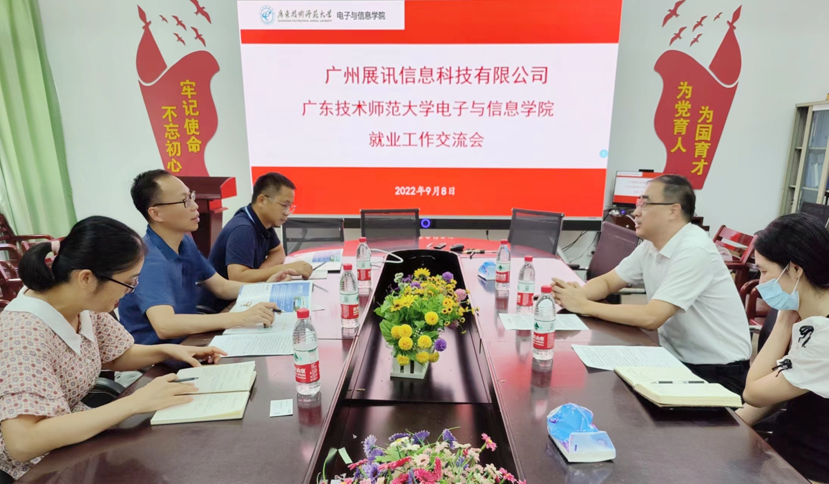 9月8日,广州展讯信息科技有限公司总经理李华一行来电子与信息学院开展校企合作洽谈会。电子与信息学院党委书记罗旭辉、副书记梁茵,学院副院长李亚等参会。