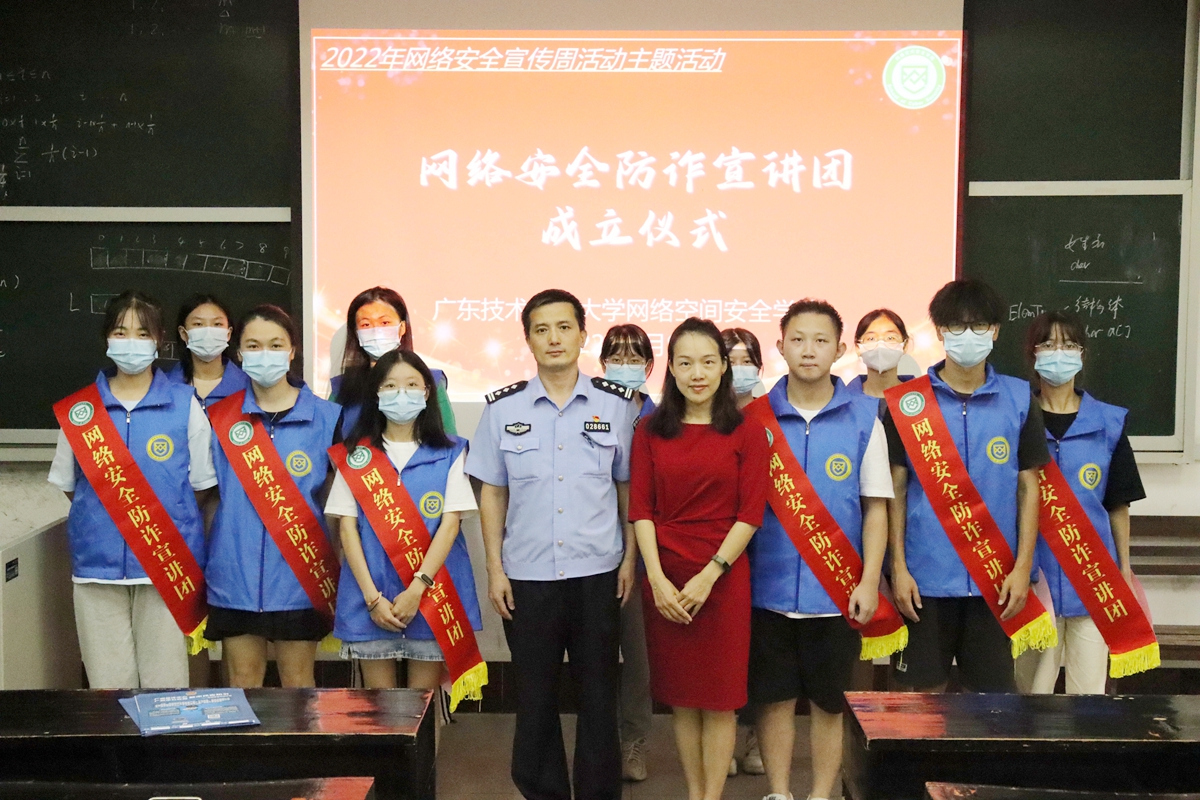 为响应2022年国家网络安全宣传周校园日主题活动要求,发挥网络空间安全专业的特色优势,更好地服务学校、服务社会,网络空间安全学院在新学期发动学生志愿者成立了网络安全防诈宣讲团。9月9日,网络空间安全学院在西校区教学楼媒体三教室举行了宣讲团成立仪式。天河区公安局石牌派出所赖钧政警官、学院党委肖茵茵副书记以及宣讲团学生代表出席了仪式。