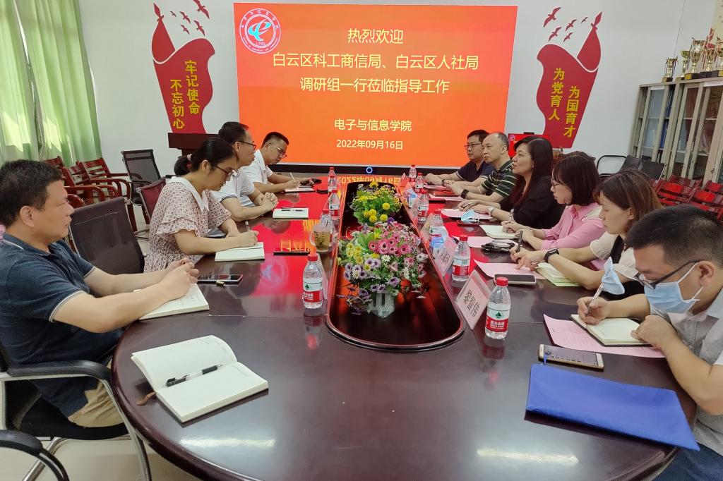 9月16日,白云区科技工业商务和信息化局党组成员、总工程师黄月霞带领科工商信、人社局调研组一行6人莅临电子与信息学院调研指导,电子与信息学院党政领导班子成员参加调研活动。