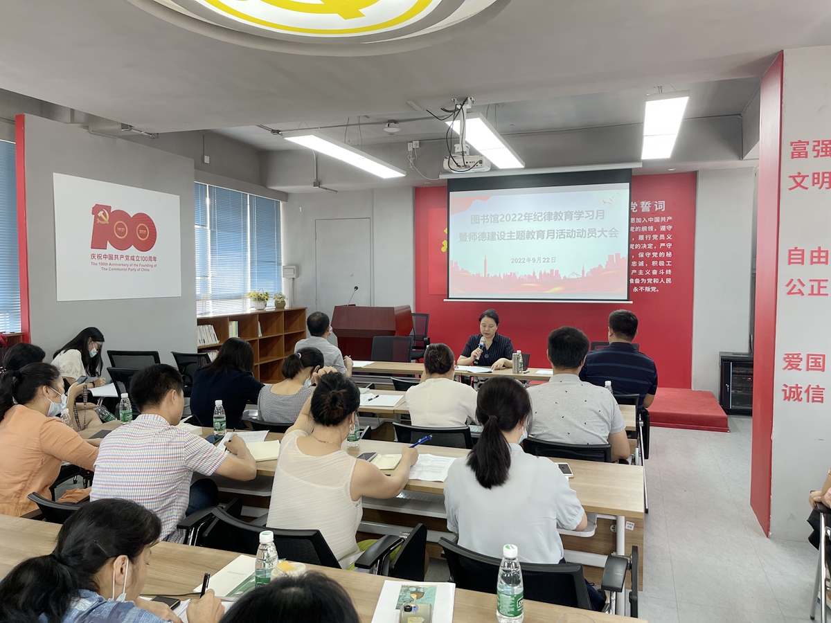 为进一步加强纪律建设,增强拒腐防变和抵御风险能力,9月22日,图书馆在初心斋举行2022年纪律教育学习月暨师德建设主题教育月活动动员大会,全体教职工参加了会议,会议由图书馆馆长白崇主持。