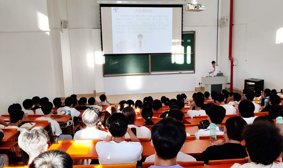 随后,IT中心大数据专家骆科钦从大数据、人工智能以及大数据专业的发展方向等方面与同学们进行了分享,并针对学院大一新生所关心的专业学习及未来的职业规划等问题给出了合理的建议。讲座内容深入浅出、生动有趣,在提问环节,骆科钦与同学们热情互动,耐心回答学生提出的问题,现场气氛活跃,取得了良好的交流效果。