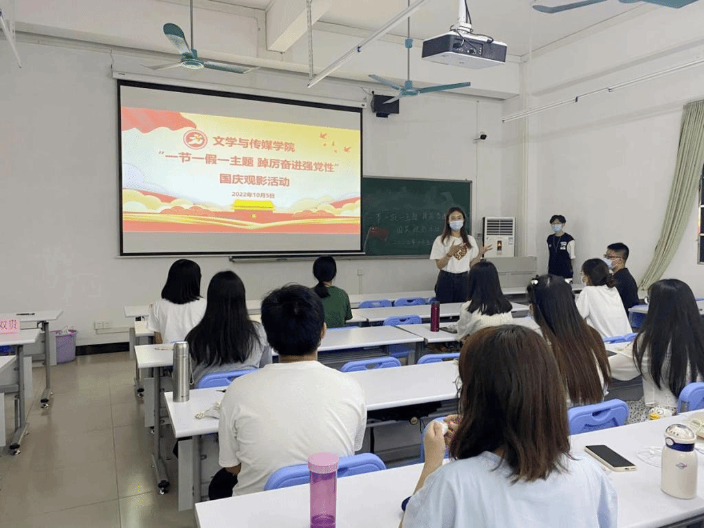 为庆祝新中国73周年华诞,进一步丰富党史学习教育内容,激发学院师生不忘初心、奋勇拼搏的使命感和责任感,同时响应“就地过节”倡议,为留校师生增强节假日氛围感,10月5日,文学与传媒学院于白云校区二教103开展了“一节一假一主题,踔厉奋进强党性”国庆观影活动,学院党委书记李双贵、学生第二党支部书记朱砂及在校学生党员、积极分子等参加了本次活动。