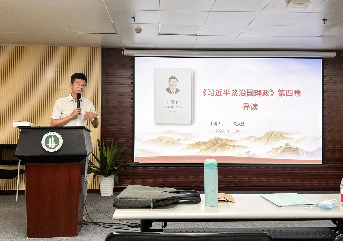 会上,黄文浩对全院各级党组织学习《习近平谈治国理政》第四卷进行了部署,并作了《<习近平谈治国理政>第四卷导读》专题党课。黄文浩从《习近平谈治国理政》四卷本的内在联系、第四卷主要内容(回答四问)、第四卷理论贡献等三个方面进行了领学,要求全体党员增强政治自觉、思想自觉、研究自觉、行动自觉,利用国庆假期自学,学懂弄通悟透《习近平谈治国理政》第四卷,切实用习近平新时代中国特色社会主义思想武装头脑、指导实践、推动教育教学工作。