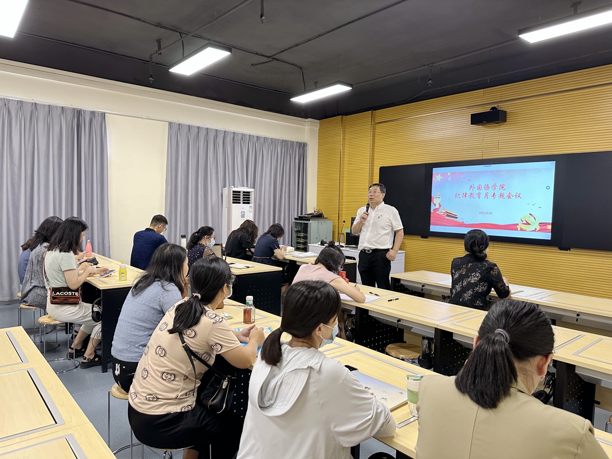 为深入开展警示教育,引导广大教职工以身作则、廉洁自律,落实我校纪律教育学习月活动安排,结合《习近平谈治国理政》第四卷主题学习,9月30日,外国语学院通过传达上级会议精神、专题学习、观看警示教育片等方式,积极开展纪律教育学习月活动。活动由外国语学院党委书记杨伟光主持,外国语学院全体教师党员参加了本次活动。