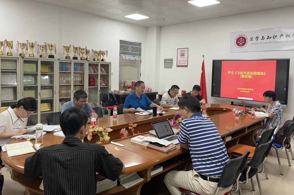 9月29日,法学与知识产权学院党委中心组召开扩大会议,专题学习《习近平谈治国理政》第四卷。学院党委委员、班子成员、各党支部书记代表等参加会议,大家分别联系学习内容和工作实际,从不同角度交流自身的学习体会。会议由学院党委书记许建鑫主持。