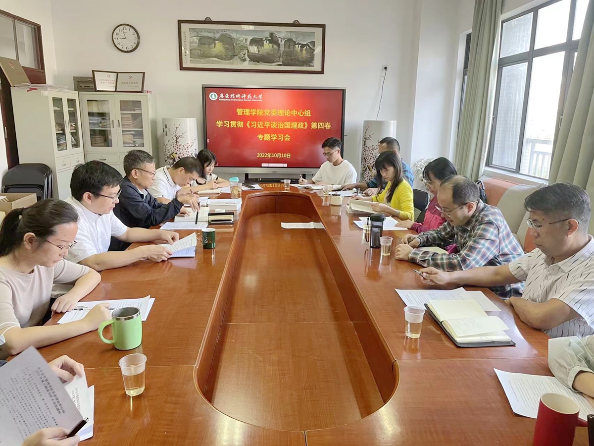 为推动习近平新时代中国特色社会主义思想入脑入心、走深走实,引导广大党员干部坚持不懈地用党的最新理论成果武装头脑、指导实践,10月10日上午管理学院党委在白云校区第一教学楼402会议室召开《习近平谈治国理政》第四卷专题学习会。管理学院党政班子成员、党委委员和教工党支部书记等参加会议,党委书记陈军主持会议。