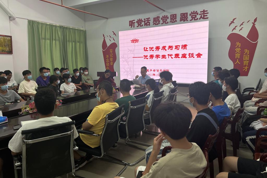 为提升学生对大学生活的认知,引导新生树立正确的价值观,确定远大理想目标,努力做新时代具有远大理想和坚定信念的爱国者,电子与信息学院于10月13日召开优秀学生代表座谈会。学院党委书记罗旭辉、党委副书记梁茵以及22级各班优秀学生代表参加了会议。