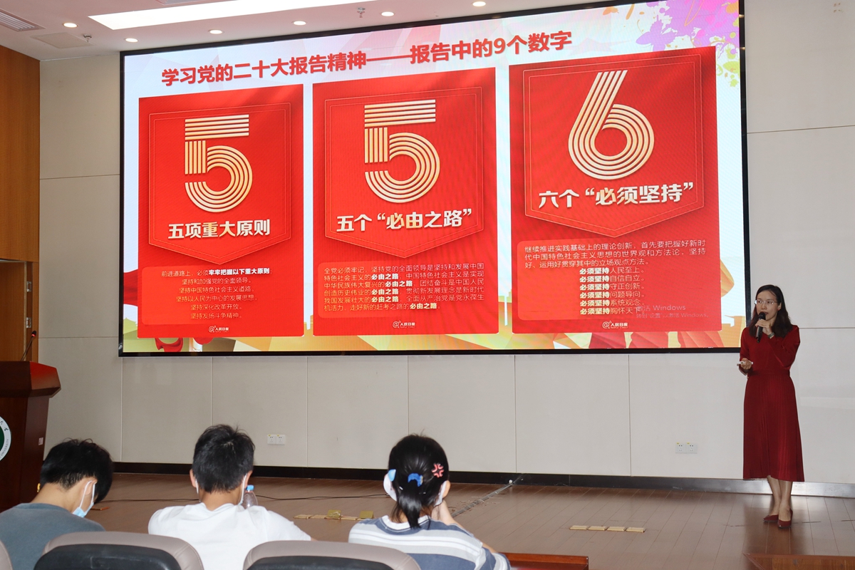 讲座由学院党委副书记肖茵茵主讲。她首先结合习近平总书记在中国共产党成立100周年庆祝大会发表的重要讲话精神和在中国共产党第二十次全国代表大会上所作的报告精神,介绍了党的性质宗旨和光辉奋斗历程,引导同学们正确认识共产党,鼓励大家永远跟党走,奋进新征程,不负习近平总书记对青年的殷切希望。