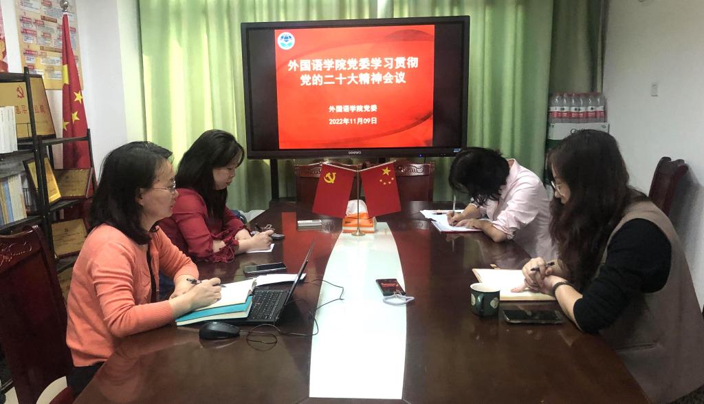 11月10日下午,外国语学院党委以线上线下相结合的方式召开会议学习贯彻党的二十大精神,进行全面动员部署贯彻落实。外国语学院全体党政领导、党支部书记参加会议,会议由学院党委书记杨伟光主持。