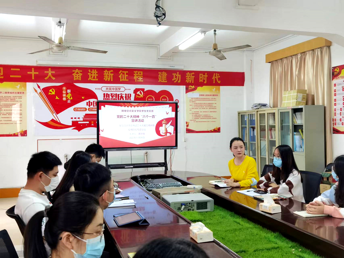 为深入学习领悟党的二十大精神,贯彻落实《广东技术师范大学党的二十大精神“六个一百”宣讲行动实施方案》,网络空间安全学院教工党支部、学生党支部分别于11月24日、11月26日面向全体师生党员开展了党的二十大精神宣讲活动。活动以线上线下相结合的方式进行,分别由支部书记主持并讲授了党课。