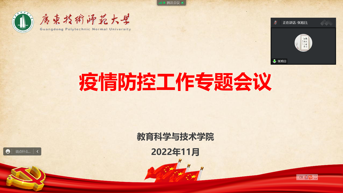 统一部署,压实工作责任。11月17日,教育科学与技术学院召开疫情防控工作部署会,深入贯彻落实党中央、国务院和学校关于加强疫情防控工作的具体要求,成立由党委书记、院长任组长,其他院领导、党支部书记、系部负责人组成的疫情防控工作领导小组,强化思想认识和责任意识。一是提高站位,进一步压紧压实疫情防控各项责任,守护师生健康平安。二是统筹兼顾,坚持把推进各项工作与深入学习宣传贯彻党的二十大精神紧密结合,确保疫情防控、教学科研、学科建设等各项工作平稳开展。三是注重引导,精心细致做好服务保障,充分发挥党员先锋,引导师生主动配合防疫工作和志愿服务。