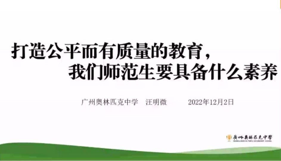 12月2日,广东技术师范大学外国语学院卓越教师系列讲座第一讲在腾讯会议平台开讲,广州奥林匹克中学校长汪明微受邀作了题为《打造公平而有质量的教育,我们师范生需要什么素养》的讲座。本次讲座由外国语学院党委书记杨伟光主持。外国语学院师生代表200余人参加了本次讲座。
