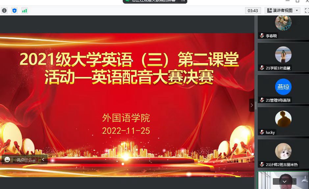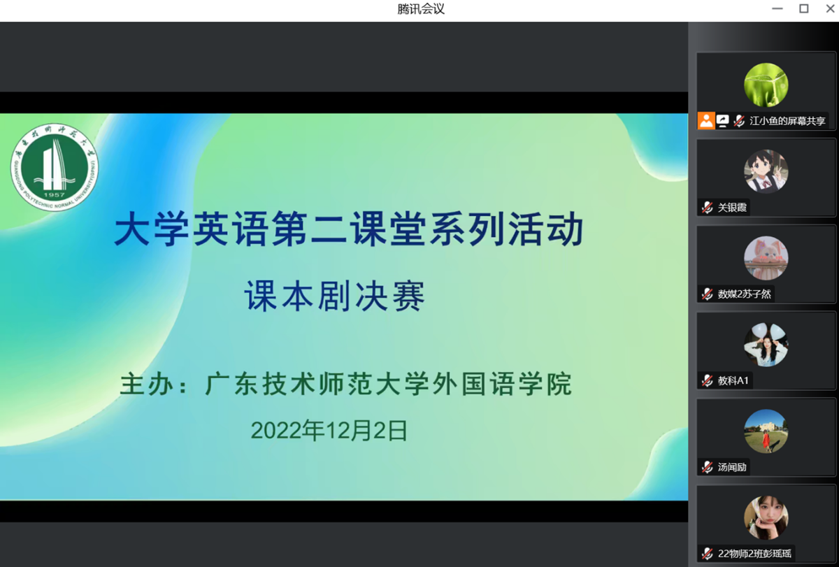 为进一步丰富校园文化生活,营造良好的英语学习氛围,深入推动我校大学英语教学改革工作,11月25日,外国语学院大学英语部线上举办了大学英语第二课堂系列文化活动,东校区、白云校区、西校区、河源校区同时进行。学校大一、大二年级分别举办了英语课文剧和英语配音赛事,我校242个英语班,近3000名学生参与比赛。经过激烈角逐,219组队伍入围复赛,最终27组队伍进入决赛,学生参赛热情高涨。决赛由外国语学院教师担任评委,全校师生均可在线观看。