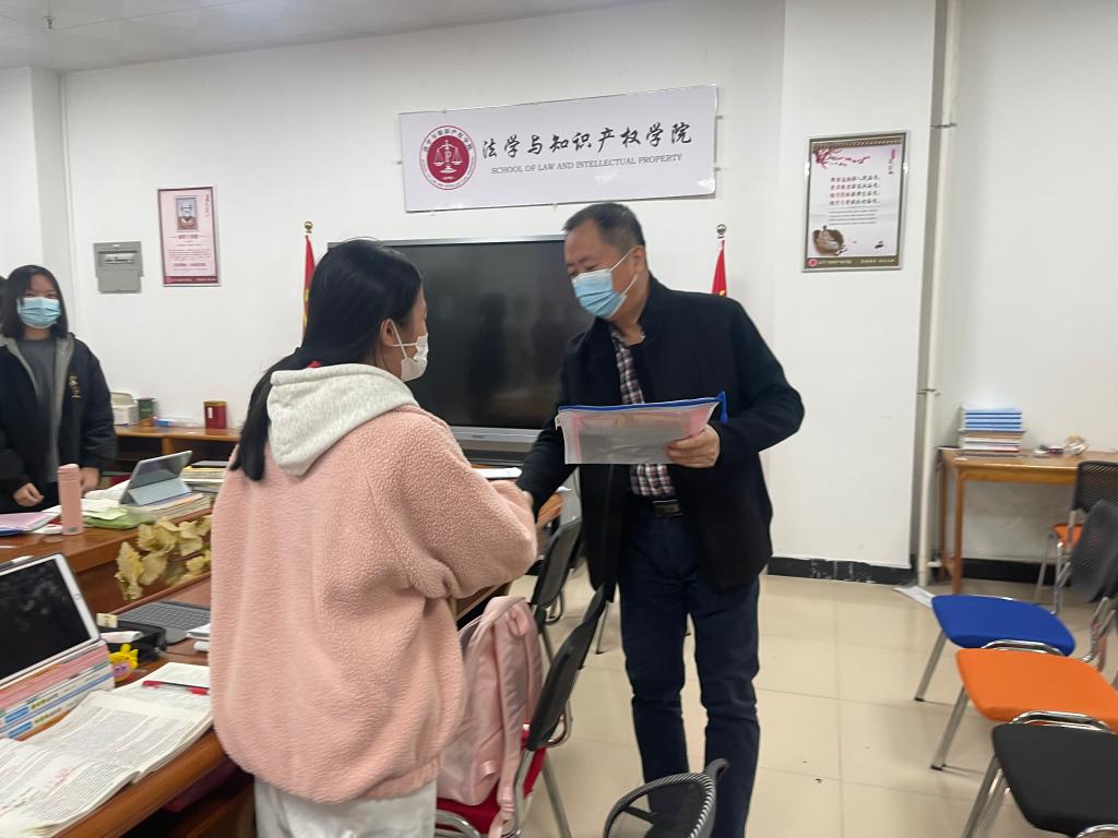 为帮助积极备战的2023届考研学子舒缓压力,增强冲刺迎考信心,以更加积极平和的心态迎接考试,11月7日,法学与知识产权学院组织开展了考研冲刺慰问活动。学院党委书记许建鑫、党委副书记李雪斌及辅导员们悉数到场,了解考研学子们的复习情况,为他们送上考研爱心大礼包,并表达深切关怀。