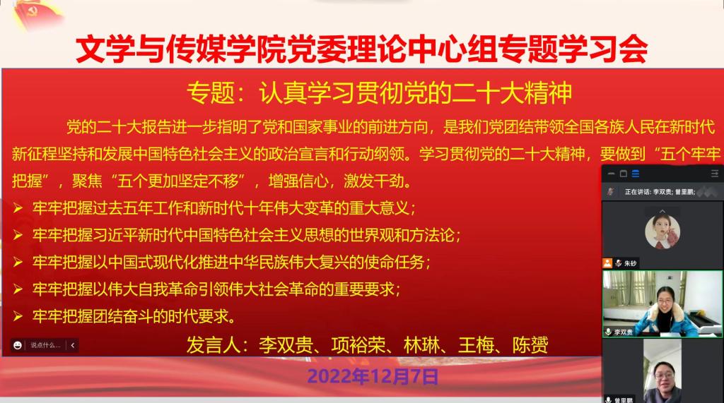 为全面、系统、深入学习贯彻党的二十大精神,将党的二十大提出的新思想新论断,作出的新部署新要求推向落实,12月7日,文学与传媒学院党委理论学习中心组通过线上召开专题学习会,围绕党的二十大精神继续深入学习交流。文学与传媒学院党政班子成员、党委委员、党支部书记等参加会议,学校党委宣传部曾里鹏老师列席旁听会议。会议由学院党委书记李双贵主持。