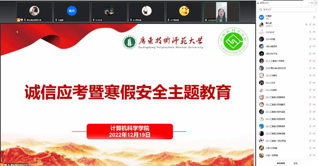 为严肃考风考纪,传承优良学风,正确引导新生度过一个安全平安的假期,计算机科学学院于12月19日在腾讯会议召开了新生年级诚信应考暨假期安全教育专题会议。学院党委副书记杨燕佳、河源校区新生年级辅导员以及全体学生干部120余人参加会议。