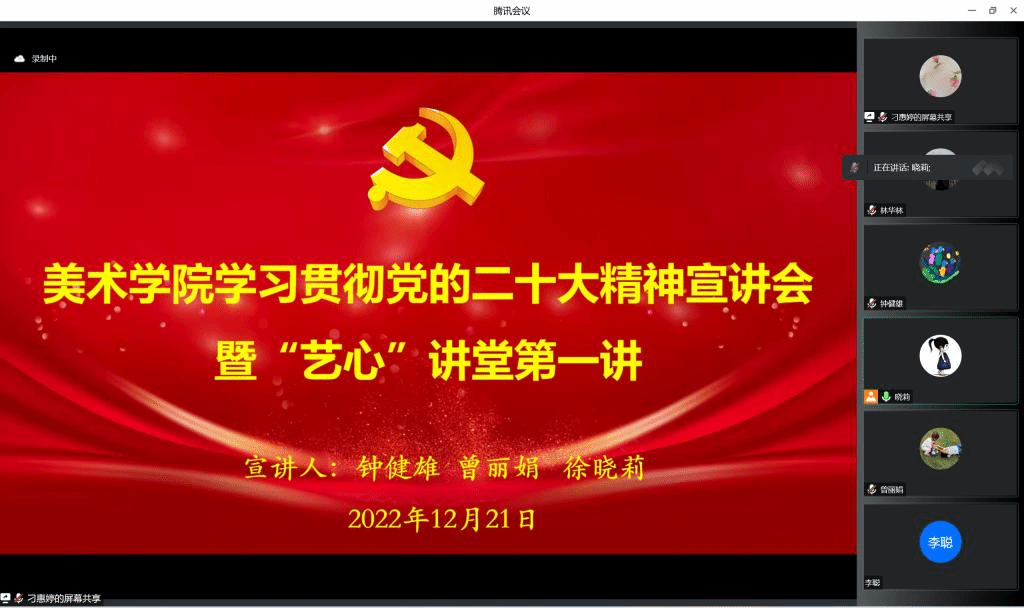 为全面深入学习宣传贯彻党的二十大精神,切实把师生的思想和行动统一到党的二十大精神上来,12月21日,美术学院开展学习贯彻党的二十大精神宣讲会。美术学院党政班子成员、党委委员、全体党支部书记、青年博士、辅导员、部分专业教师及学生代表等参加会议。美术学院党委书记钟健雄、全省“党建工作样板党支部”艺心党支部书记曾丽娟、学校“党建工作样板党支部”教工第二党支部书记徐晓莉作了专题宣讲。