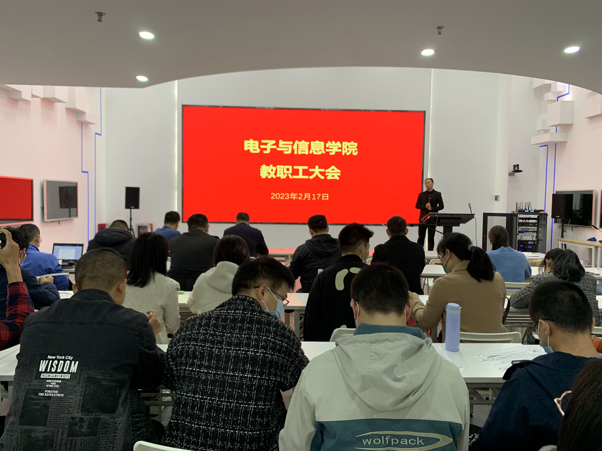 为更好贯彻落实学校第二期高质量发展战略研讨会精神,2月17日,电子与信息学院在东校区工业中心106会议室召开新学期高质量发展研讨会,全面总结学院在2022年取得的成绩,明确了2023年学院发展方向。电子与信息学院全体教职工参加了此次会议。